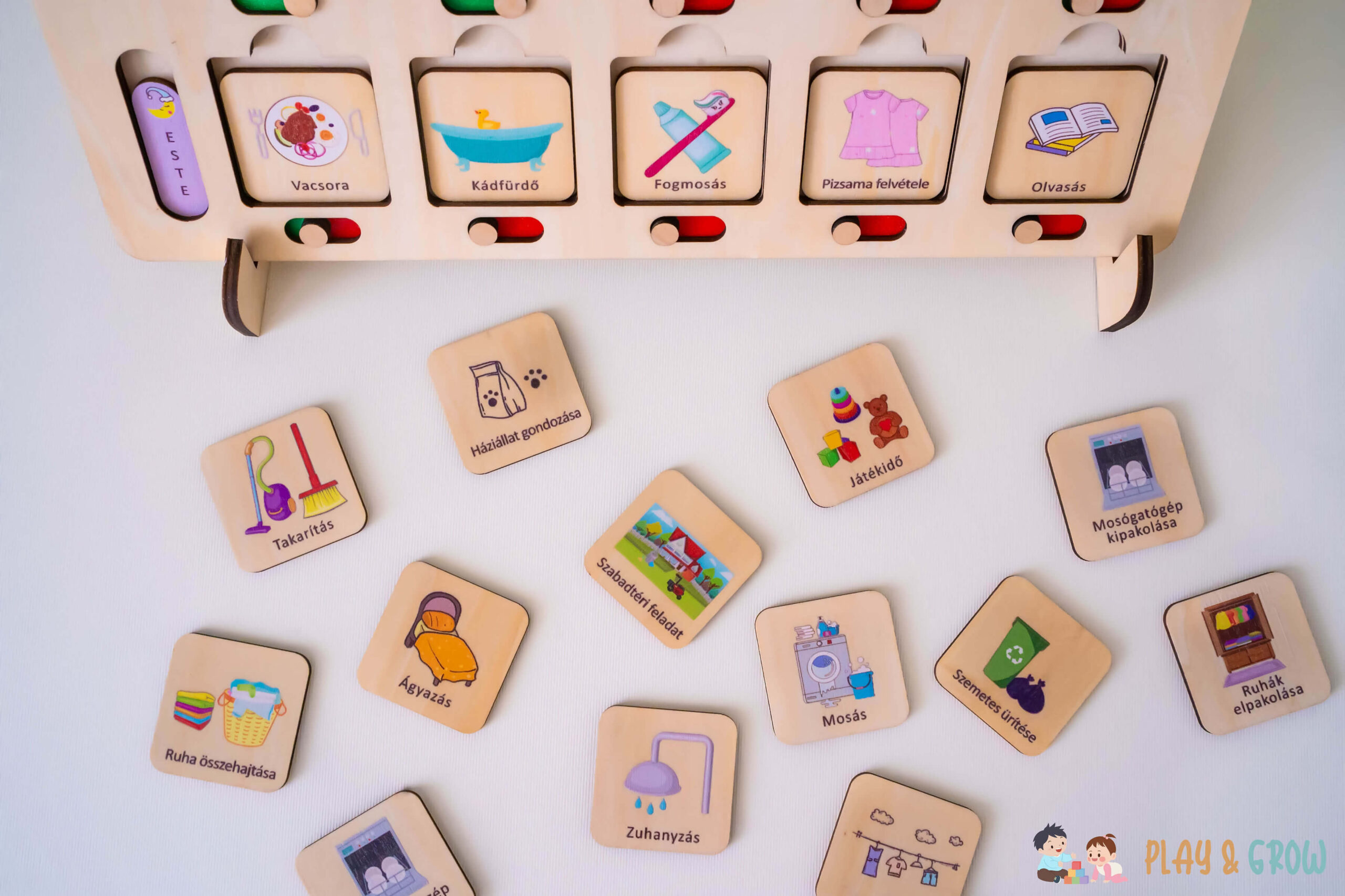 A kártyák cserélhetők, így mindig a gyermek aktuális napirendjéhez igazíthatóak.