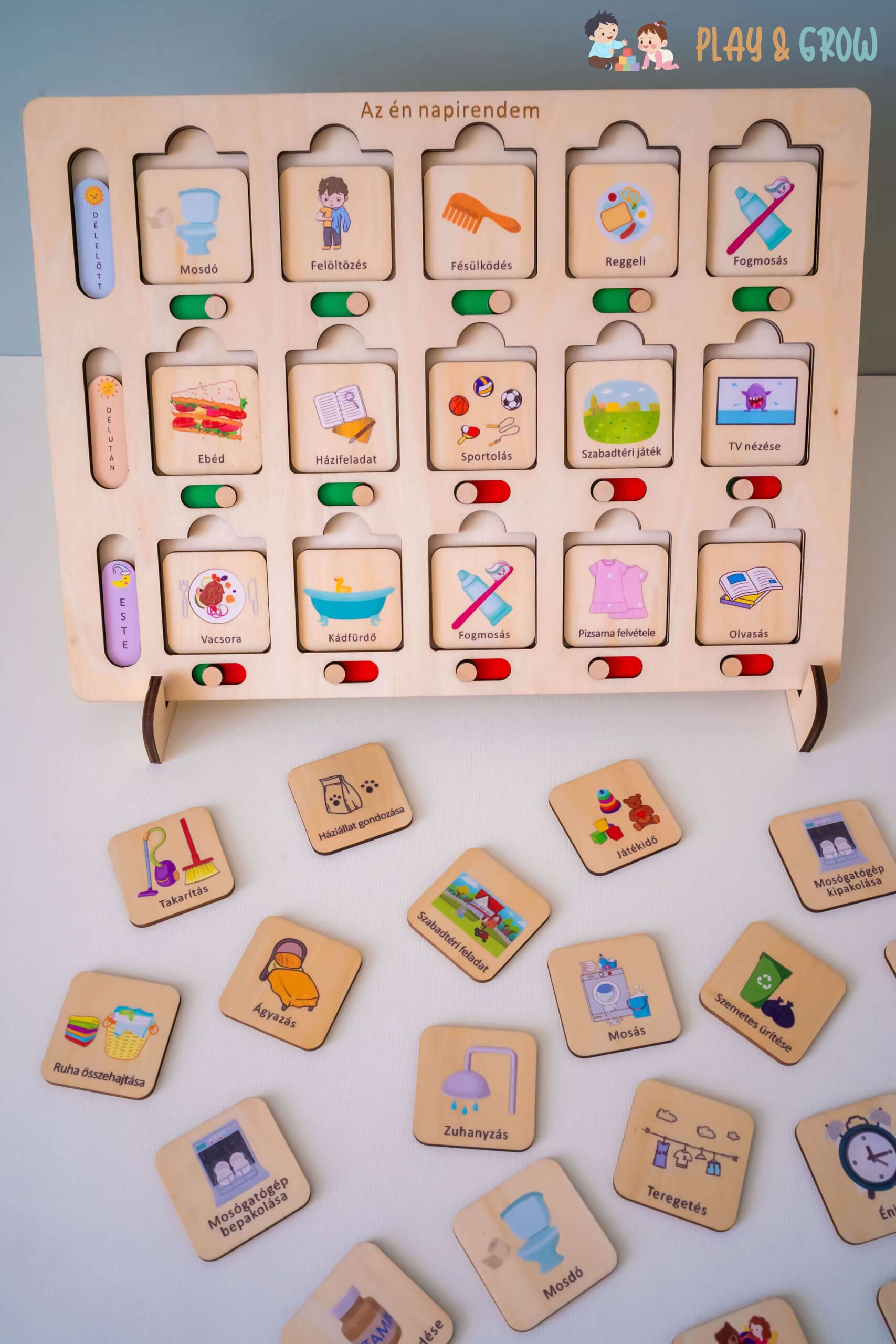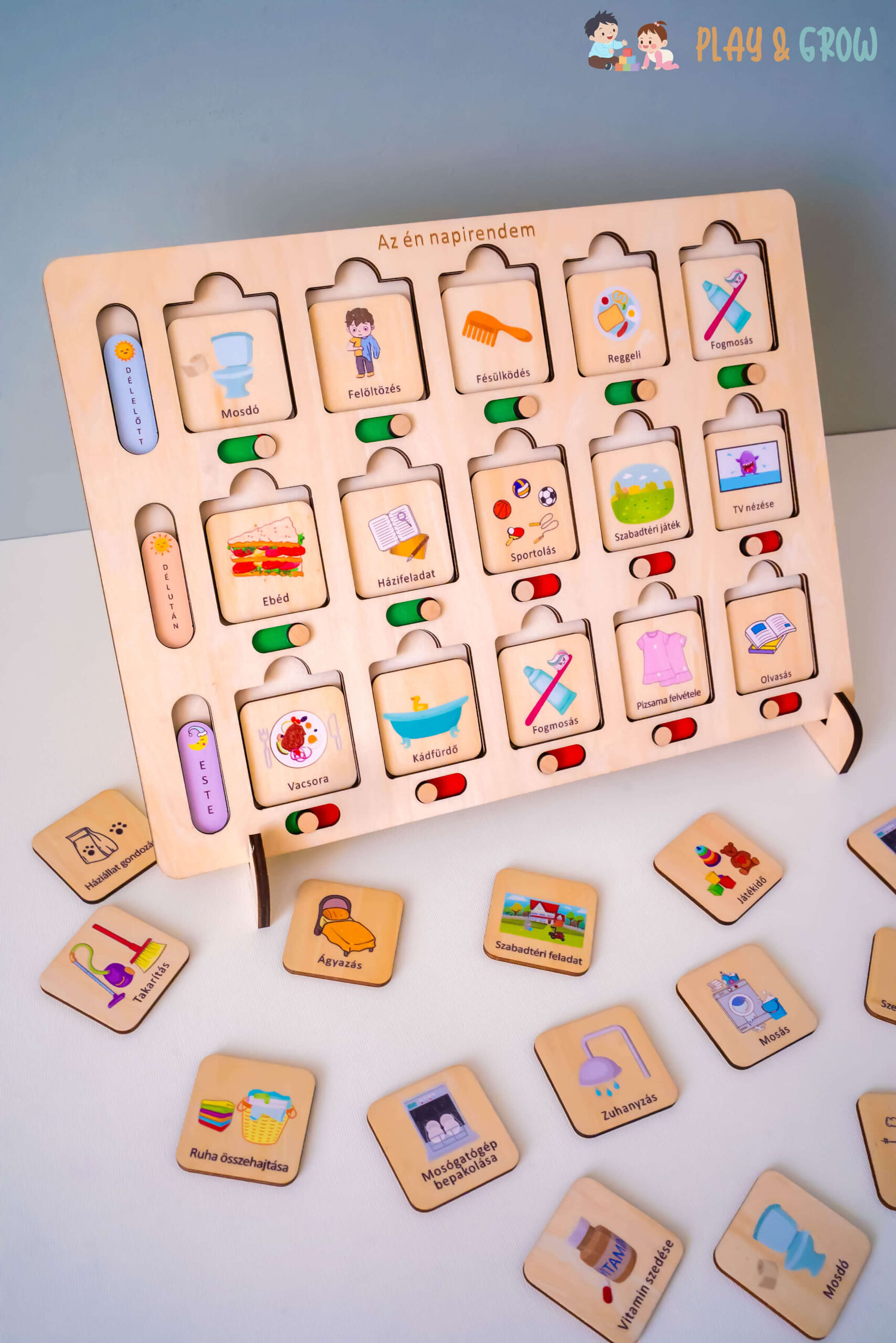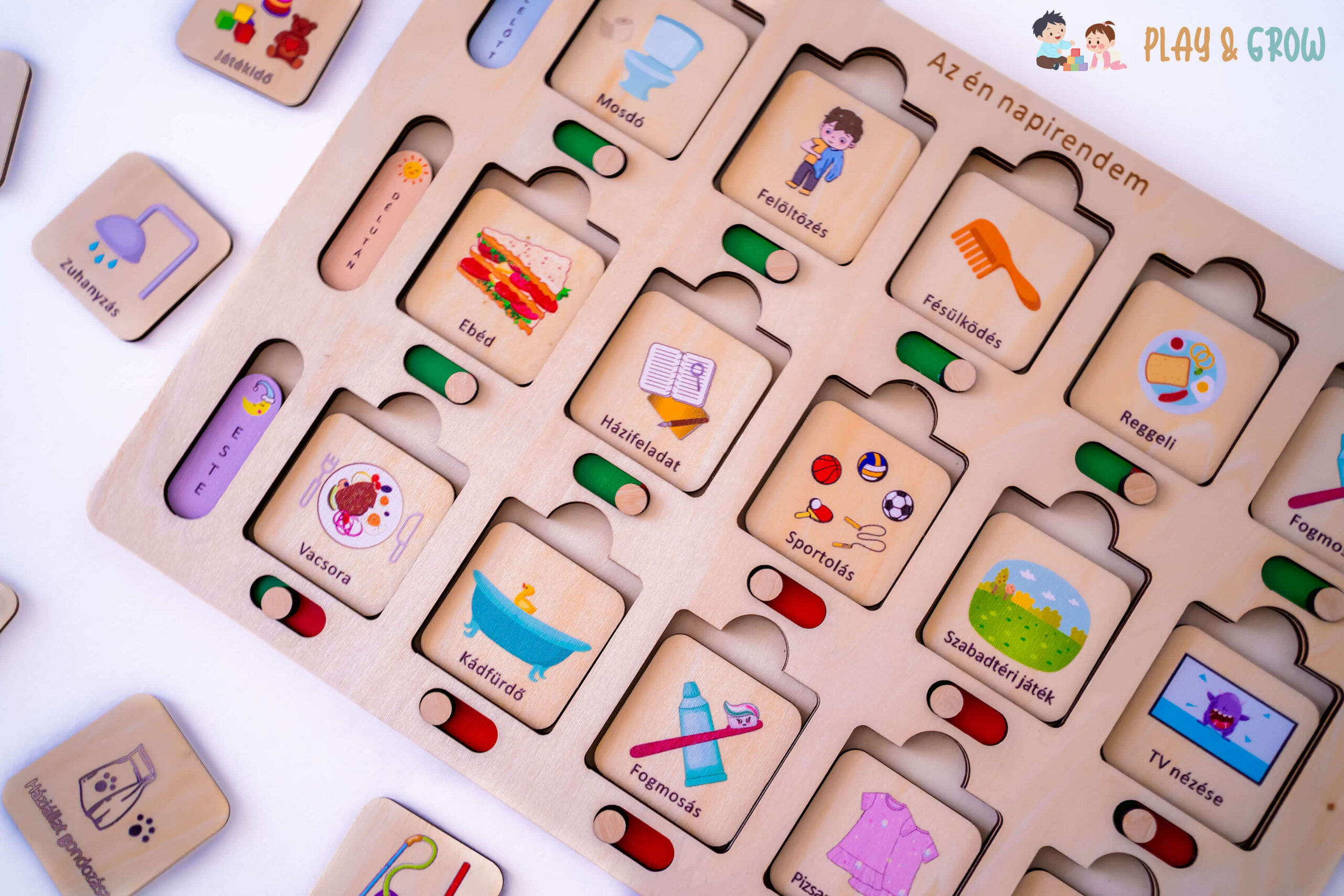 A gyermekek számára a rendszeresség és a kiszámíthatóság kulcsfontosságú. Ez a fából készült, interaktív napirend tábla játékos módon segít kialakítani a napi rutint, ami hozzájárul a biztonságérzetükhöz és az önállóságuk fejlődéséhez.